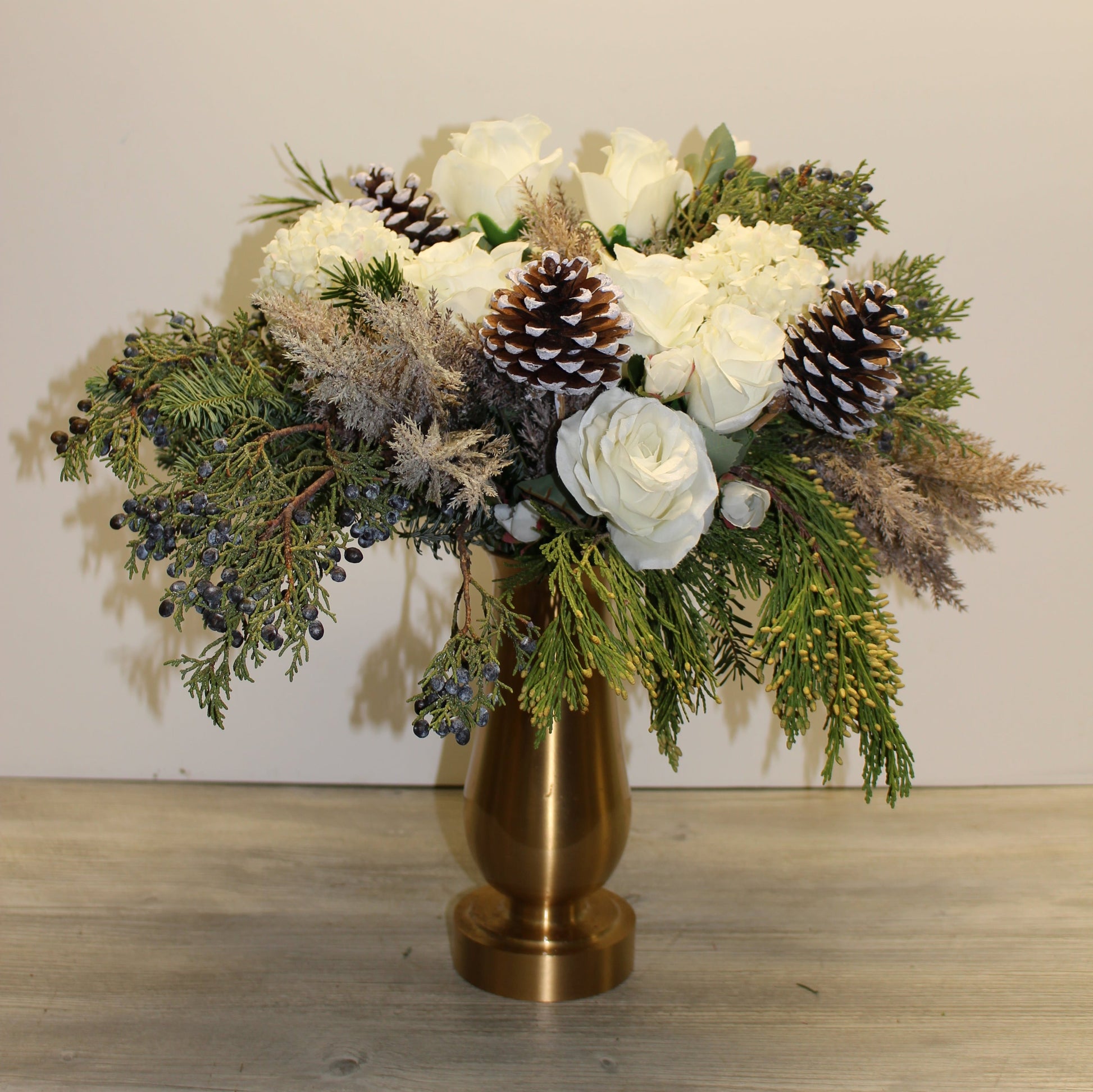 White alstromeria, mini carnations, roses, baby's breath, pinecones and mixed fresh winter greens.