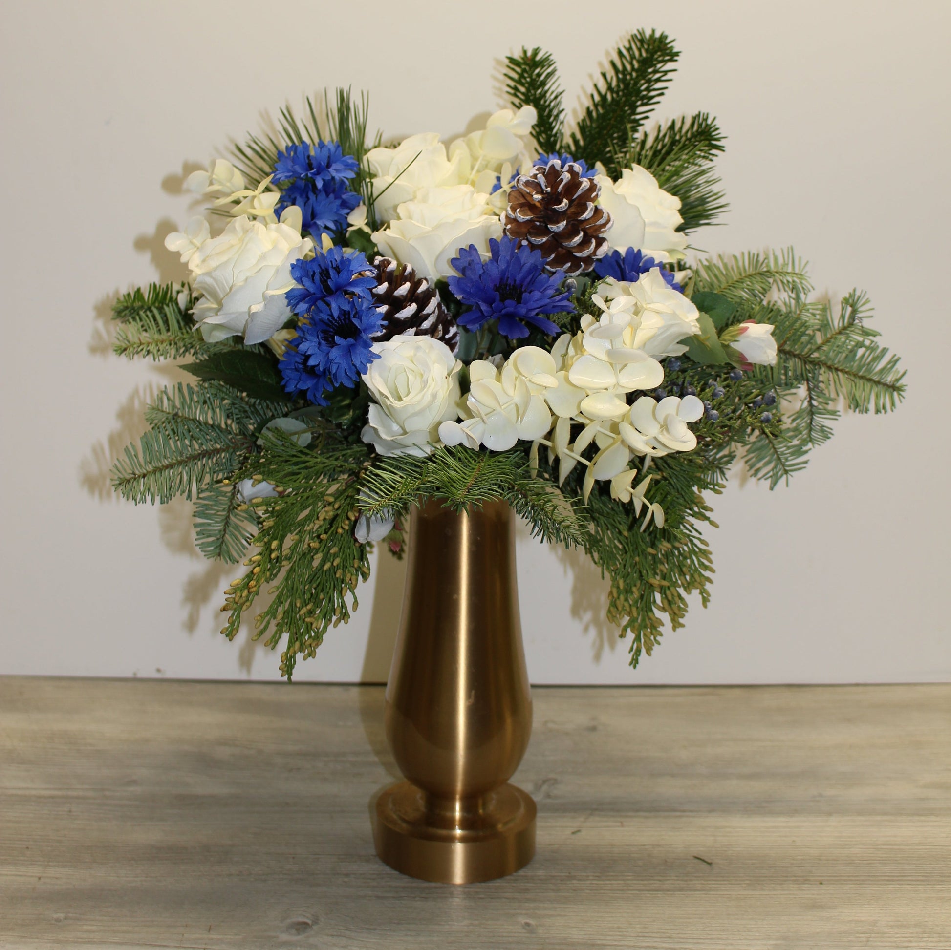 White hydrangea, alstromeria with blue roses, astilbe and mixed fresh winter greens.